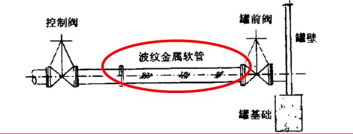 金屬軟管應設置在罐前閥與管線連接處,使儲罐與管線之間形成軟連接。當罐前管線工藝流程處于帶壓狀態時,安裝金屬軟管時應設置控制閥。安裝金屬軟管時要防止焊渣飛濺到軟管上。不應采用強緊法蘭、螺栓的方法消除安裝偏差。金屬軟管安裝后距自然地面的高度應大于其橫向位移補償量。在金屬軟管上不應設置任何托架或支撐。
